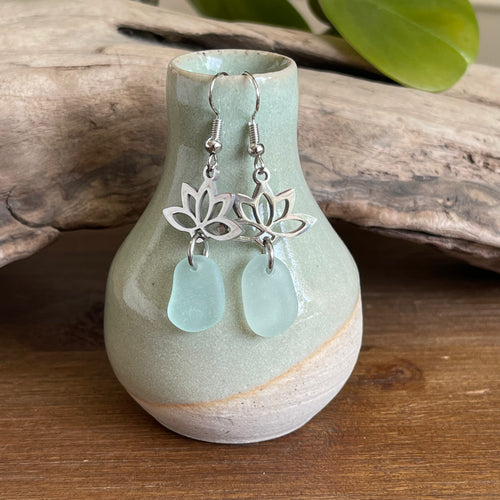 Light Aqua Blue Genuine Sea Glass Lotus Earrings
